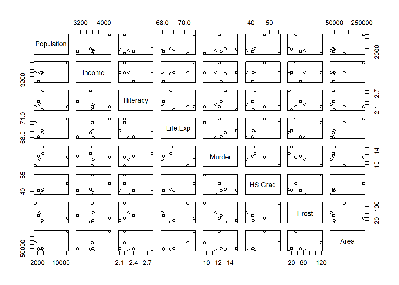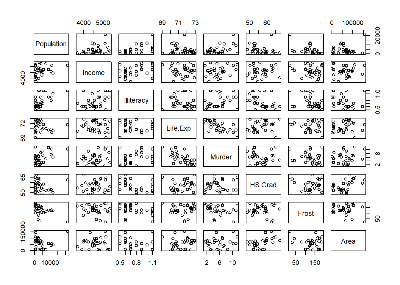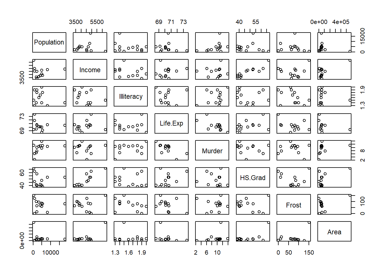 cut (data.frame (state.x77)$Illiteracy, 3)), pairs)